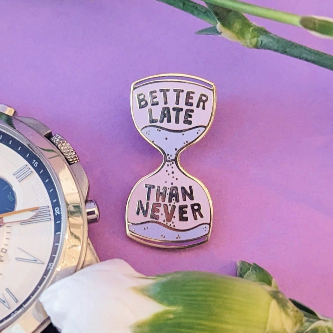 Maybe you're looking for a gift for a colleague who is never on time? Or a funny gift for a friend to serve as a little reminder that you have noticed their poor punctuality throughout the years. Our "Better Late Than Never" enamel pin is a fantastic choice!